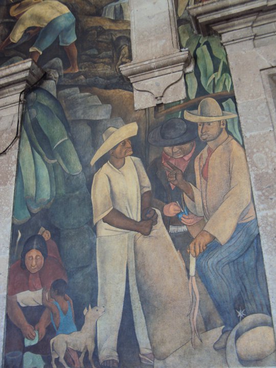 Voordat ik in Mexico-Stad op zoek ging naar de muurschilderingen, de murals, dacht ik dat ze op de buitenmuren van openbare gebouwen zouden staan. Voor mij als toerist dan niet ingewikkeld om te fotograferen. Maar in de meeste gebouwen, zoals het Nationaal Paleis, het Ministerie van Onderwijs en het Hooggerechtshof vond ik ze in een binnenplaats of ergens ‘verstopt’ in het gebouw zelf. Zo’n overheidsgebouw krijgt dan de functie van een museum. In groot formaat trok een deel van de Mexicaanse geschiedenis aan mij voorbij: van de Spaanse verovering tot de revolutie van 1910. De meeste murals in openbare gebouwen werden in de jaren 1920 door Diego Rivera, José Clemente Orozco en David Alfaro Siqueiros geschilderd in opdracht van de eerste president na de revolutie. Hij en zijn opvolgers zagen de nieuwe waarden graag terug in de kunsten.